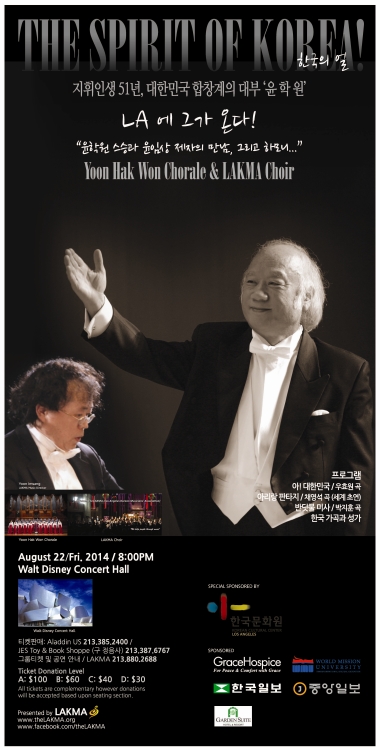 This concert will represent “The Spirit of Korea.” It will be performing by Conductor Hak Won Yoon, a vice president of International Federation for Choral Music and a judge of World Choir Games, with members of Yoon Hak Won Choral and also Conductor Im Sang Yoon, a leader musician of Korean-American community, with LAKMA chamber choir.