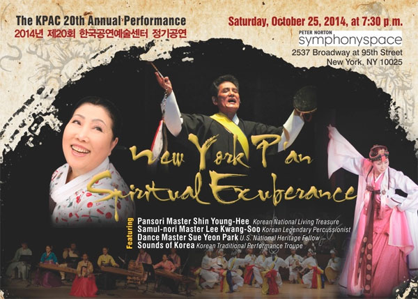 The Korean Performing Arts Center (KPAC) is proud to announce its 20th Annual Performance, New York P'an: Spiritual Exuberance, on Saturday, October 25 at 7:30 p.m. at Symphony Space. The event will feature some of the most celebrated traditional performing artists direct from Korea, including Master Shin Young-Hee, an extraordinary pansori singer, who has been designated the official holder (National Human Treasure) of the Important Intangible Cultural Asset, No. 5, Pansori, and Master Lee Kwang-Soo, a legendary percussionist and vocalist of shaman ritual and songs. The two masters will be joined by Sounds of Korea, New York’s foremost Korean performing ensemble presenting a range of folk songs, percussion ensemble music and folk dance, under the direction of Master Sue Yeon Park, designated in 2008 a National Heritage Fellow by the National Endowment for the Arts, the nation’s highest honor in the Traditional Arts. This year’s event recreates the tradition of P’an, an indoor or outdoor open stage performance where spectacular traditional arts have traditionally been available and accessible to all social and economic classes, breaking the boundaries between performers and audiences, a critical element of importance for the artistic aesthetic and spiritual bonds of shamanistic rituals.