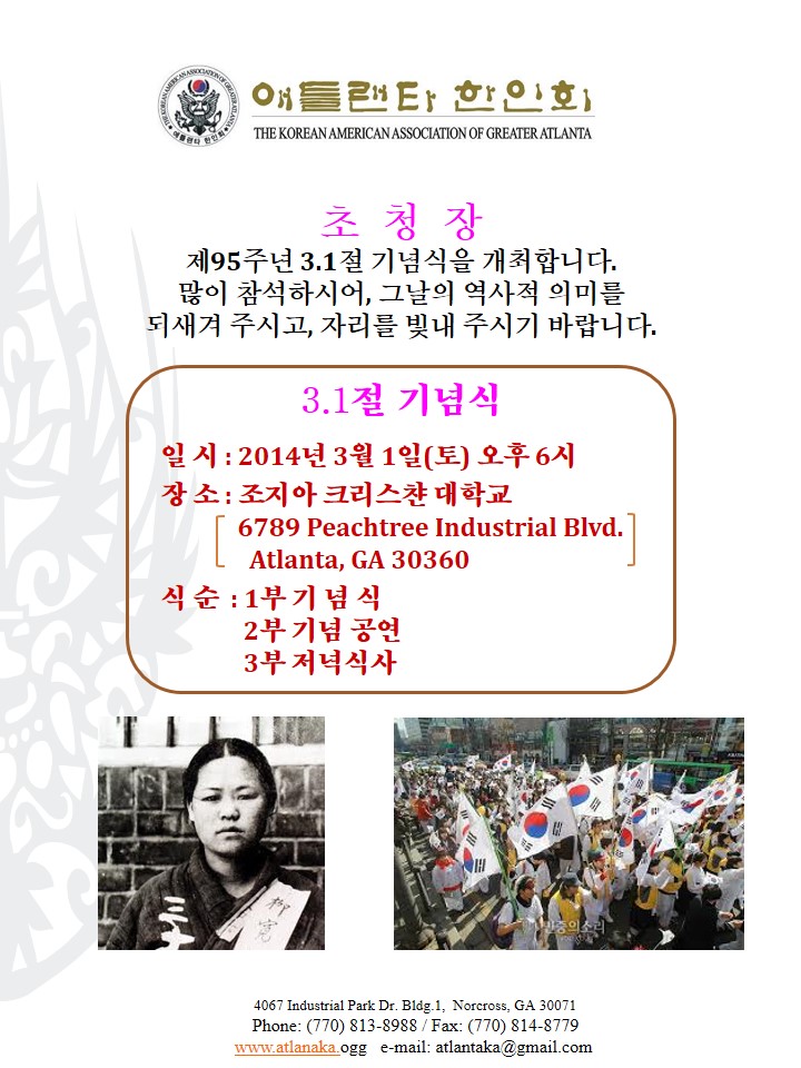 안녕하세요.제95주년 3.1절 기념식이 아래와 같이 개최됩니다.바쁘신 일들이 많으시겠지만 참석하시여그날의 의미를 되새겨 주시면 감사하겠습니다.1. 일시 : 2014년 3월 1일 토요일 오후 6시2. 장소 : 조지아 크리스챤 대학교 (6789 Peachtree Industrial Blvd. Atlanta, GA 30360)3. 식순 - 1부 : 기념식 - 2부 : 기념공연 - 3부 : 만찬감사합니다.