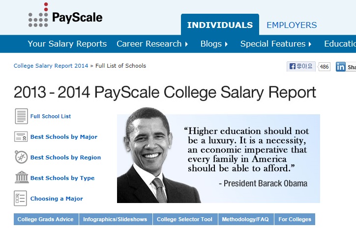 14일(현지시간) 미국의 연봉통계 분석업체인 ‘페이스케일’이 미국 대학 1000여곳 졸업생 140만명을 상대로 직장 연봉을 조사한 ‘2013-2014 칼리지 샐러리 리포트’에 따르면, 정답은 ‘그렇지 않다’였다.