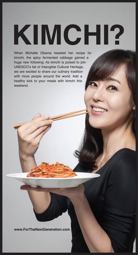 광고는 ‘Kimchi?’라는 짧고 간단한 제목 아래 “미국 영부인인 미셸 오바마 여사가 김치담그는 법을 트위터에 올리자 매운 맛의 절인 배추에 엄청난 관심이 모아졌다. 김치가 유네스코가 정한 인류무형문화유산에 오르는 것을 계기로 전 세계 수많은 사람들과 한국 음식을 나누게 돼 몹시 기쁘다. 이번 주말 당신의 식탁에서 김치의 건강하고 매운 맛을 느껴 보는 게 어떠냐?”는 설명이 달려있다.