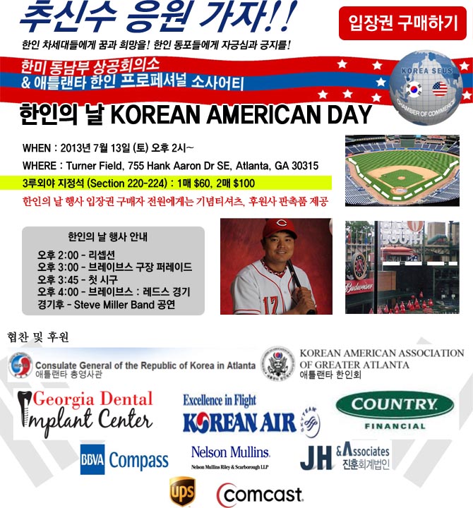 오는 7월13일(토) 애틀랜타 브레이브스의 홈구장인 터너 필드에서는 추신수 선수가 활약하는 신시내티 레드스와의 경기에 앞서 ‘한인의 날(Korean-American Day)’ 기념행사가 열린다.