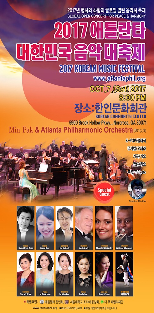 COMING UP! PEACE & HARMONY OPEN CONCERT 2017 KOREAN MUSIC FESTIVAL Atlanta Philharmonic Orchestra Conductor: Min Pak OCT 7 (SAT), 8:00 PM at Korean-American Association Cultural Center in Atlanta Address:5900 Brook Hollow Parkway, Norcross,Ga 30071 A-$20 (Ticket Donation) RSVP 678-978-2220 or (Please use PayPal on the right side to make reservation of your seat and bring your receipt to hav…