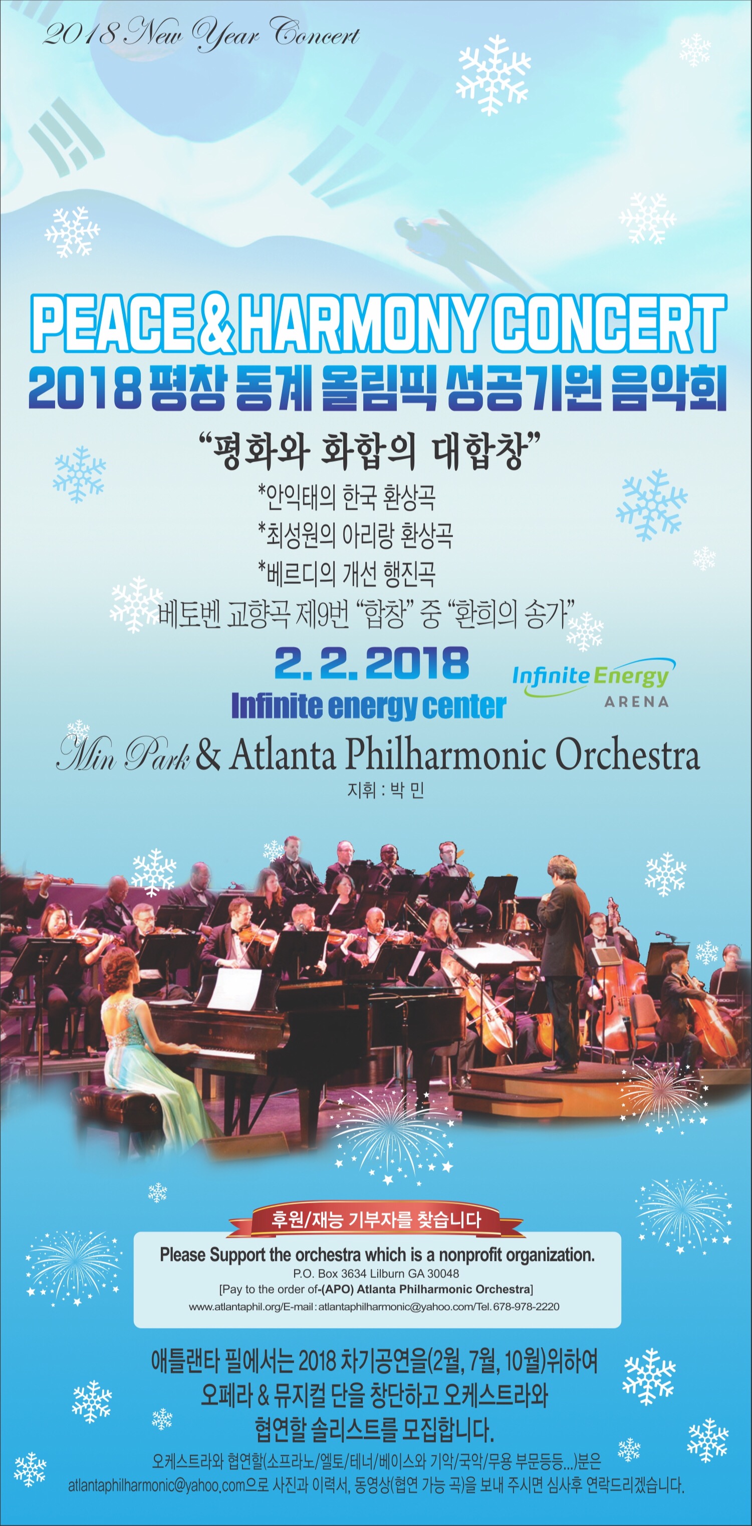 LET's GO TO PC If you are a music fan in variety based on classical western and eastern music including Ben-Hur Overture, "Doll" area by Offenbach, and Rhapsody in Blue and many more, come and enjoy your Friday night to celebrate your new year to be happy in melody, on February 2nd, 2018 7 PM, Infinite Energy Center in Duluth, GA. “ Let’s go, Peong Chang!” This concert is a commemorative performance of Pyeong Chang W…