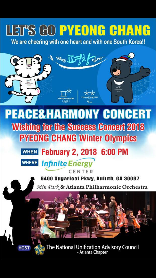 This concert is a commemorative performance of Pyeong Chang Winter Olympic games in South Korea. Presenting by Atlanta Philharmonic Orchestra and Hosted by the National Unification Advisory Council Republic of Korea-Atlanta Chapter with many greatest instrumental and vocal soloists including pianist Gary Menzies, Hyunjee Yoon and Pedro Carreras and more are featuring musicians.