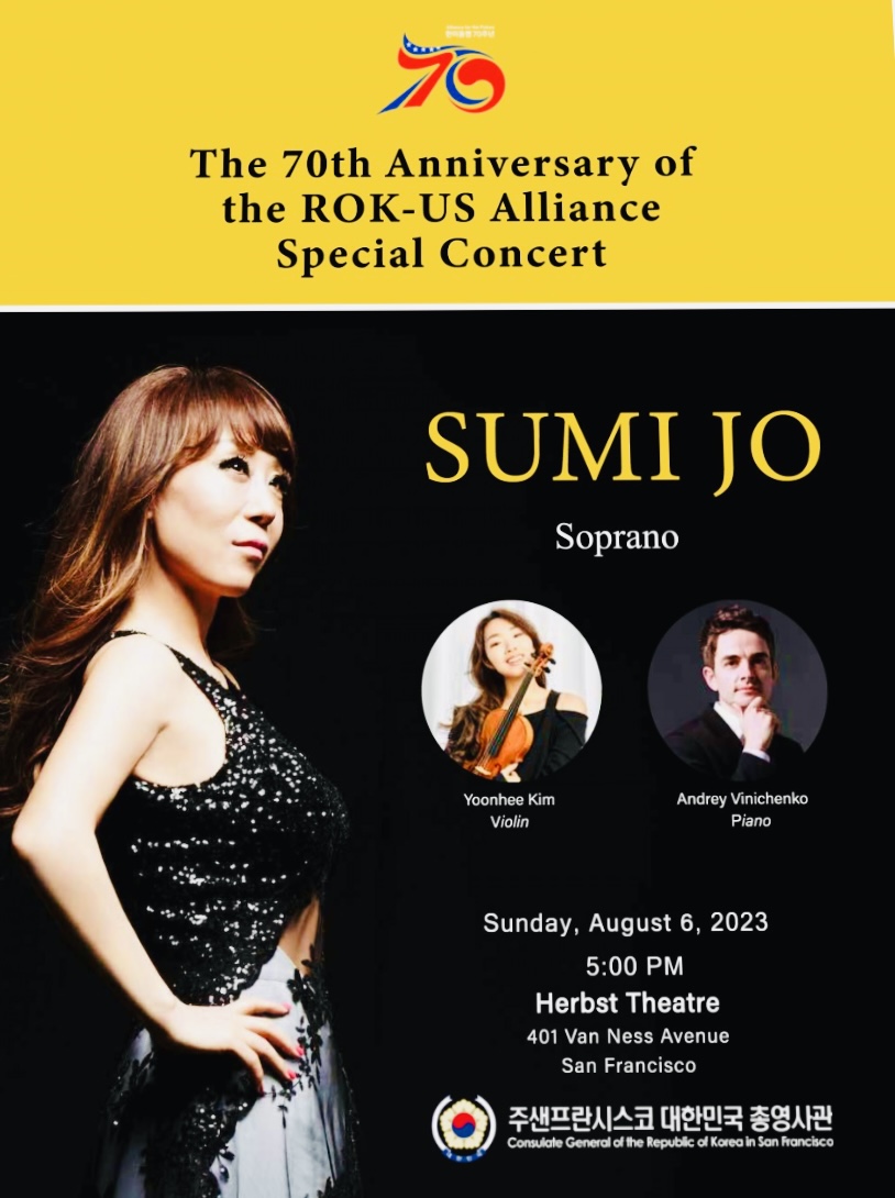 주 샌프란시스코 대한민국 총영사관( 총영사 윤상수) 은 한미동맹 70 주년을축하하기 위해 8 월 6 일(일) 오후 5 시에 San Francisco War Memorial & Performing Arts Center (주소: 401 Van Ness Ave, San Francisco, CA 94102) 의 협스트 극장에서 세계적인 소프라노 조수미 콘서트를 개최한다.