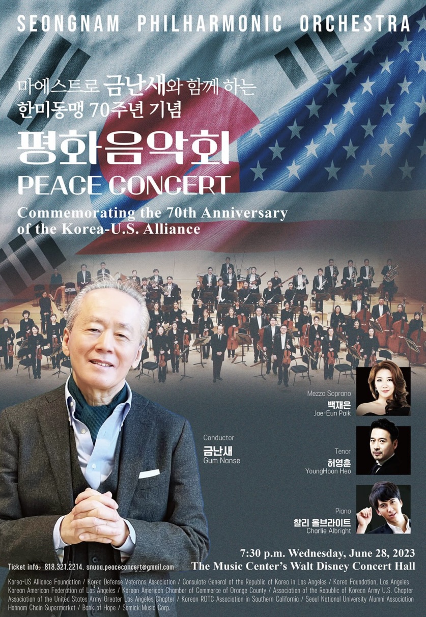 2023년 한국전 정전 70주년과 한미동맹 70주년을 기념하며 2023년 6월 28일 (수) 오후 7:30분 캘리포니아 로스앤젤레스의 월트 디즈니 컨서트 홀에서 평화음악회가 개최된다.