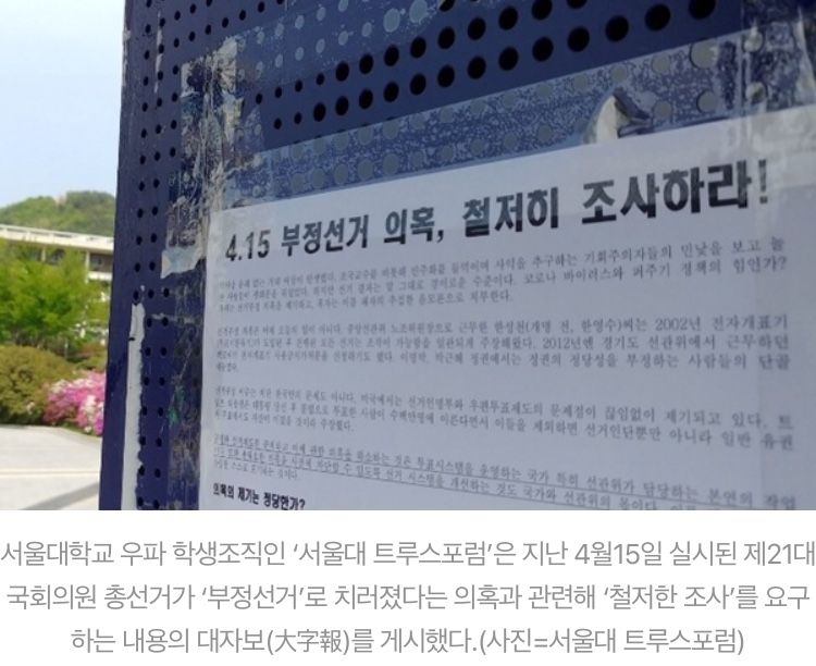 서울대학교 우파 학생조직인 ‘서울대 트루스포럼’은 지난 4월15일 실시된 제21대 국회의원 총선거가 ‘부정선거’로 치러졌다는 의혹과 관련해 ‘철저한 조사’를 요구하는 내용의 대자보(大字報)를 게시했다.