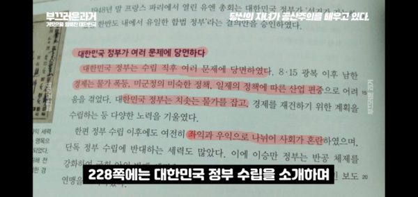 유튜브 영상 ‘당신의 자녀가 학교에서 공산주의를 배우고 있습니다’에서는 대한민국과 북한의 정권수립을 다룬 현대사 부분을 중점적으로 조망했다.
