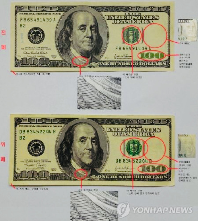 지난 2014년 부산세관에서 적발한 슈퍼노트급 100 달러 짜리 위조지폐. 중국에서 297장을 들여오려던 2명에게 압수한 물품. 사진 위는 100달러 짜리 진폐, 아래는 위조 지폐. | 연합뉴스