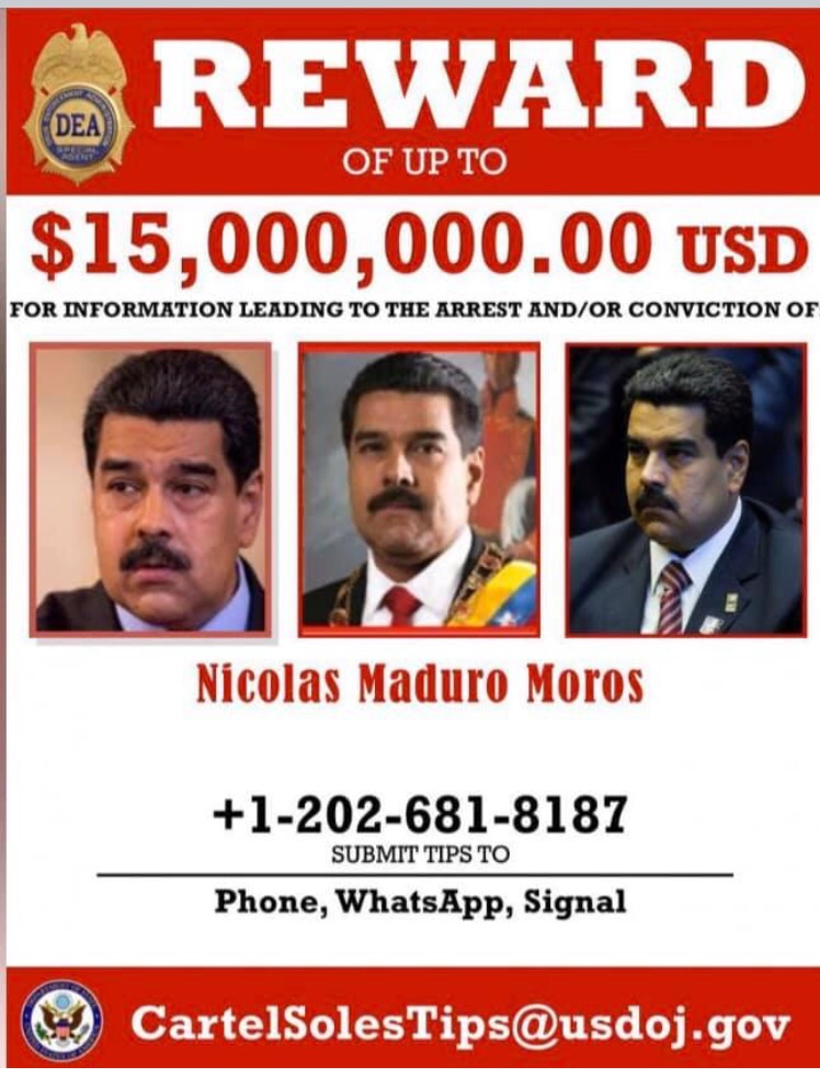 미 법무부는 3월 26일 니콜라스 마두로 베네수엘라 대통령을 ‘마약테러’(narco-terrorism) 혐의로 기소한다고 밝혔다. 이와 함께 미 국무부는 마두로 대통령 체포와 유죄 선고에 결정적인 정보를 제공한 사람에게 1,500만 달러(한화 약 184억원)의 현상금을 제공하겠다고 밝혔다.