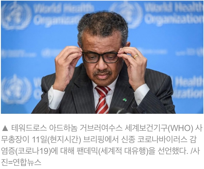 세계보건기구(WHO)는 11일(현지시간) 신종 코로나바이러스 감염증(코로나19)에 대해 세계적 대유행, 즉 팬데믹을 선언했다.