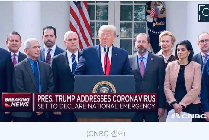 트럼프 대통령은 이날 오후 백악관 로즈가든에서 기자회견을 열고, 신종 코로나바이러스 감염증(COVID-19) 확산에 따른 국가비상사태를 공식 선포했다. 트럼프 대통령은 주 정부가 코로나바이러스 전염병에 대응하기 위해 500억 달러의 연방 재난구호기금에 접근할 수 있다고 밝혔다. 이에 따라 주정부는 긴급요원과 의료물품, 검진, 백신 접종에 들어가는 비용의 75%를 연방정부에 요청할 수 있다. 이날 국가비상사태가 선포되자 미국 주식시장은 급등했다.