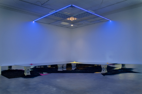 Hur has received wide acclaim for her floor installations comprised of hand-shredded silk flowers. In this exhibition Hur presents a new aesthetic direction in her construction of visual and psychological space. The collaborative installation engages lighting designer, Rebecca Makus and writers, Kristin Juarez, Lilly Lampe, and Ruiyan Xu. The exhibition includes a collection of objects and materials including powders, silk flowers, dirt, and broken pots. These objects will be laid on to multiple platforms around the gallery space, which include a cement floor, glass floor, and a light panel. The writers’ texts that explore ideas of interior will be installed on the gallery walls. A System of Interiority invites the viewer to experience the installation over time as the light changes – this transformation of space is an essential part of perception and understanding of surroundings. This collaborative installation will continue Hur’s ongoing narratives of loss and rupture. The exhibition is a provocative exploration of materials and lighting that are intended to facilitate dialogue about the notion of psychological, interior space.
