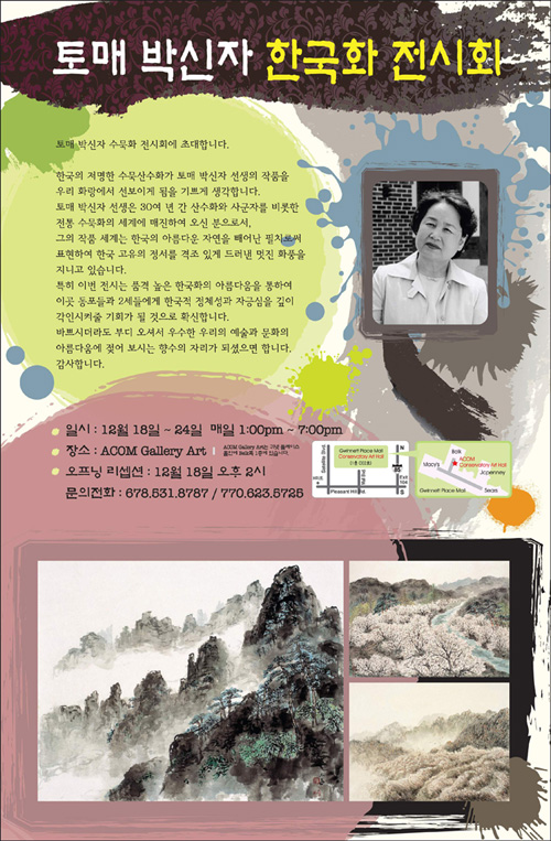 December 18, 2010 - December 24, 2010. 동양화가 토매 박신자<사진>의 개인전이 오는 18일부터 24일까지 둘루스 귀넷 플레이스 몰에 있는 ACOM 갤러리(대표:박민)에서 열린다.