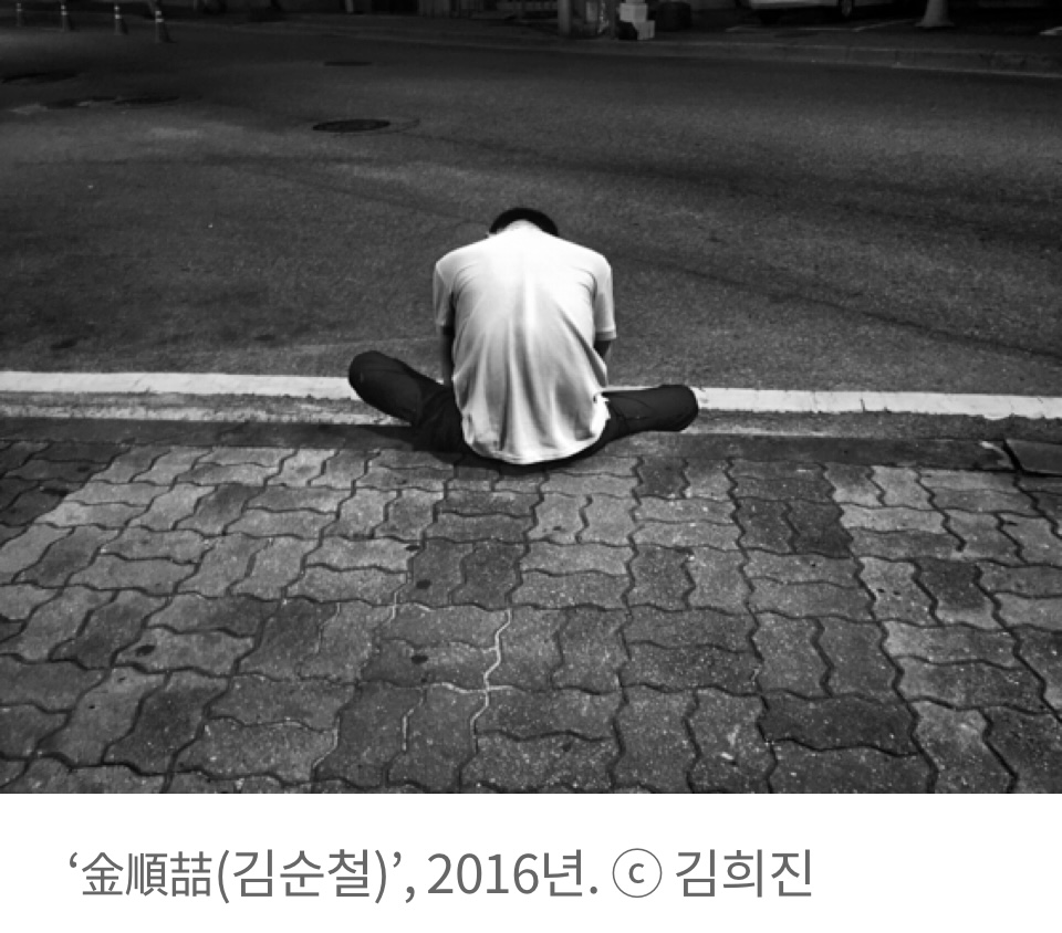 그 기록들이 ‘金順喆’이라는 제목의 전시와 사진집으로 묶였지만, 사진 어디에도 김순철은 없다. 차도와 인도의 경계에 주저앉은 취객의 뒷모습, 버려진 시계, 신문지가 덮인 배달 쟁반, 날아가는 연…모두 보아도, 김순철씨의 얼굴이 어떻게 생겼는지조차 알 수 없다.