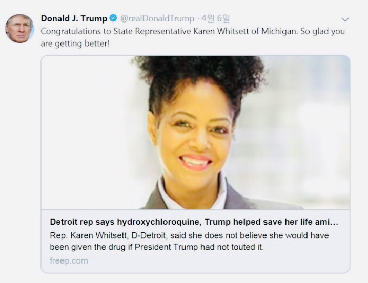 디트로이트가 지역구인 캐런 휫셋 미시간주 하원의원(여ㆍ민주)은 7일 “트럼프의 말을 듣고 코로나 바이러스와의 전쟁을 극복했다”고 말했다고 지역언론 디트로이트 프리프레스가 보도했다. 지난달 18일쯤 심한 몸살 증세를 느낀 휫셋 의원은 별다른 처방약없이 지내던중 지난달 30일 코로나19 양성 판정을 받았다. 그는 지푸라기라도 잡는 심정으로 ‘트럼프를 믿어보자’며 31일 의사의 허락을 받아 남편과 이 약을 항생제와 복용했다. 그러자 불과 2시간만에 호흡곤란 증세가 완화되는 것을 느끼고 부어오른 사이너스(부비강)ㆍ림프종이 가라앉았다는 것이다.