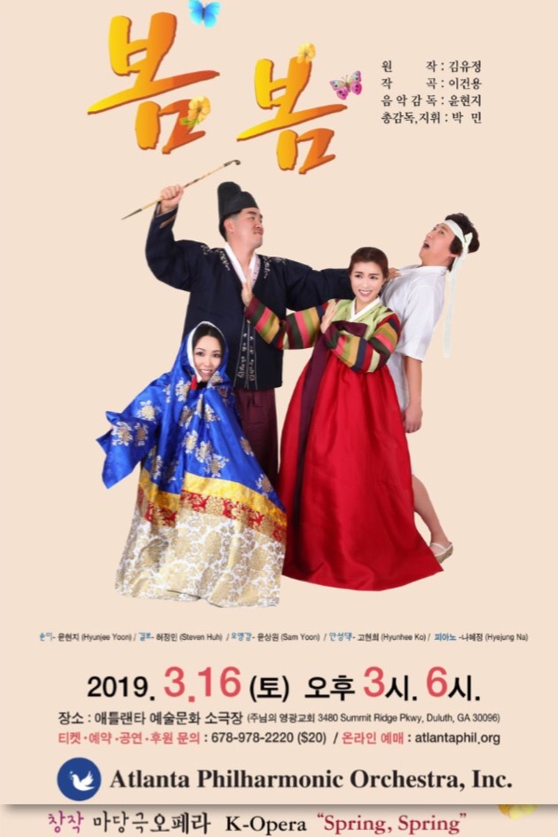 “Spring Spring” has received much praise for moving the hearts of international audiences while managing to capture the distinct, powerful themes of Korean culture.The music director of the opera, Hyun-Ji Yoon, also plays the female protagonist. Yoon graduated from the Manhattan College of Music and Ewha Womans University with a Masters degree in the Arts. The extremely talented vocalist has won both the New York International Vocal Competition and the San Diego Artists Vocal Competition. Joining her in the opera are numerous Korean-American vocalists currently active in the community as well as the Atlanta Philharmonic Orchestra.