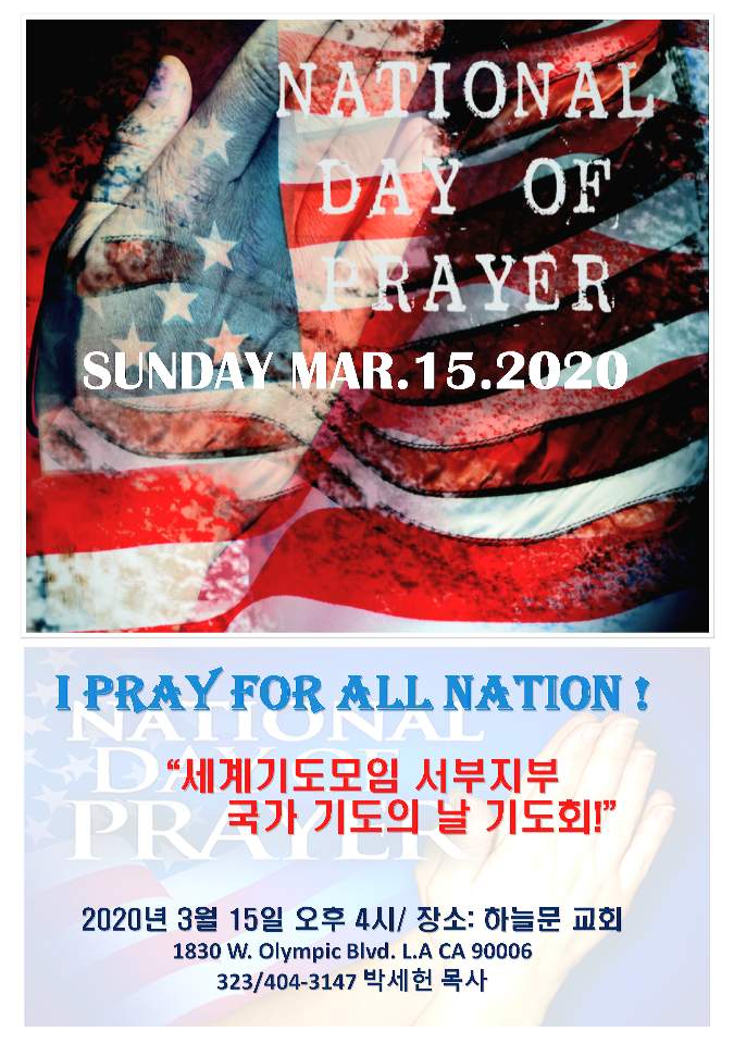3월 15일(주일) 오후 4시에 하늘문교회에서 세기모 서부지부 국가를 위한 기도회가 있습니다.