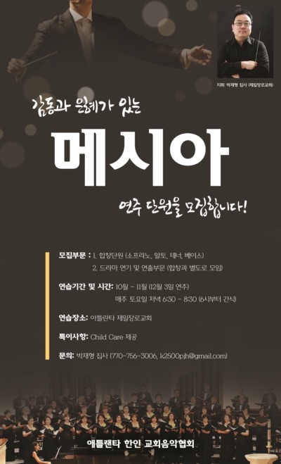 교회음악협회 주최 메시아 자선음악회에 참여할 합창단원을 모집합니다.