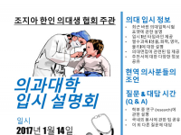 다음 주 토요일 (1/14) 오후 1시에 노크로스에 있는 애틀란타 한인회관에서 조지아 한인 의대생 협회 주관으로 의대 입시 설명회를 갖습니다. 의대에 관심있으신 학생분들 그리고 학부모님들 오셔서 좋은 정보 얻어 가시면 좋을 것 같습니다. MCAT, research, personal statement, application process, recommendation letter 등등 다양한 토픽이 커버될 예정입니다. 또…