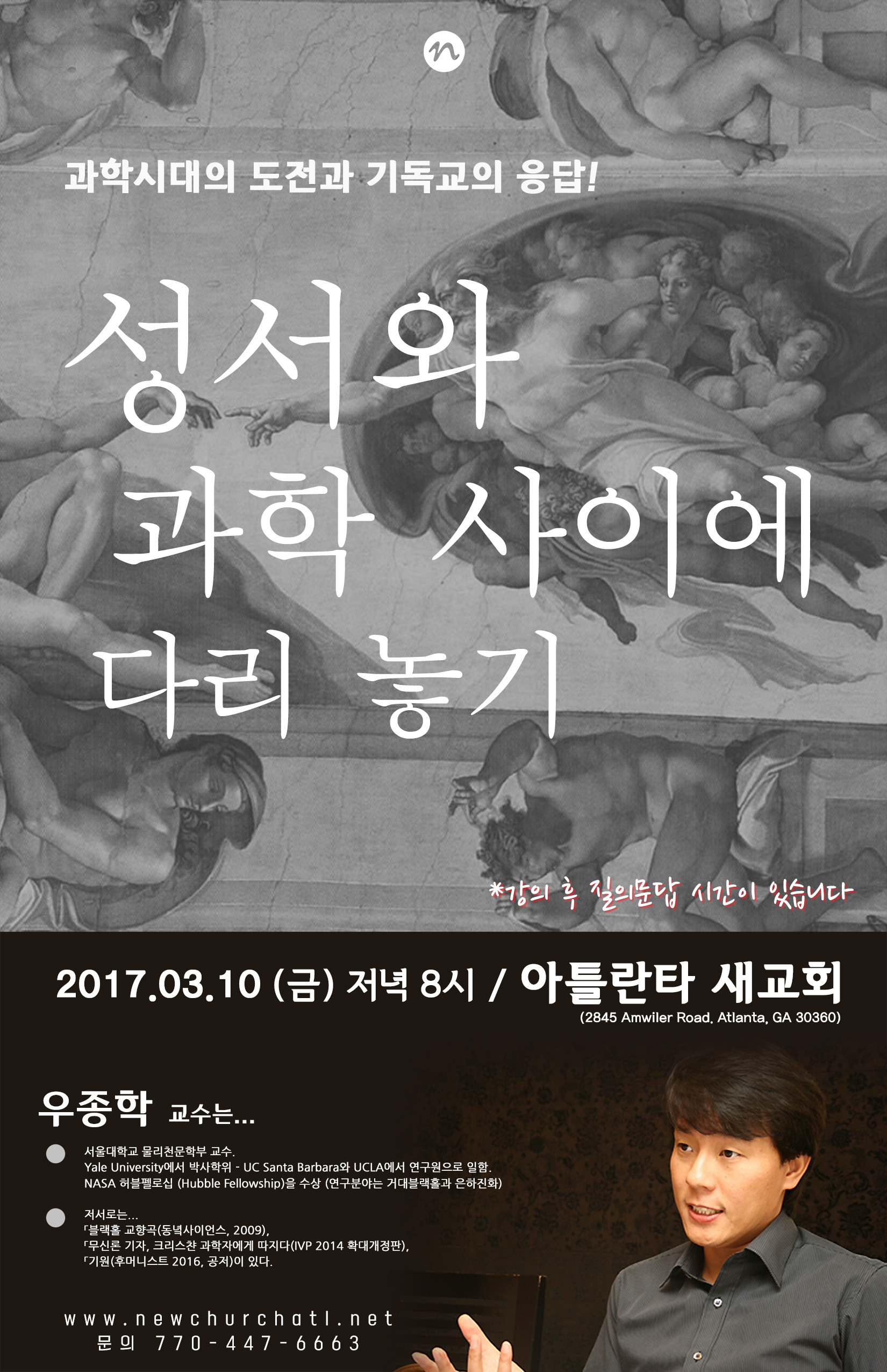과학시대의 도전과 기독교의 응답! "성서와 과학 사이에 다리 놓기" '아틀란타 새교회'에서 주최하는 세미나/강의입니다. 우종학 교수 를 초청해 과학과 신앙/신학에 대해 듣고 배우는 시간입니다. 날짜: 2017년 3월 10일 (금요일) 시간: 저녁 8시 장소: 아틀란타 새교회 주소: 2845 Amwiler Road Atlanta GA 30360 웹사이트: w…